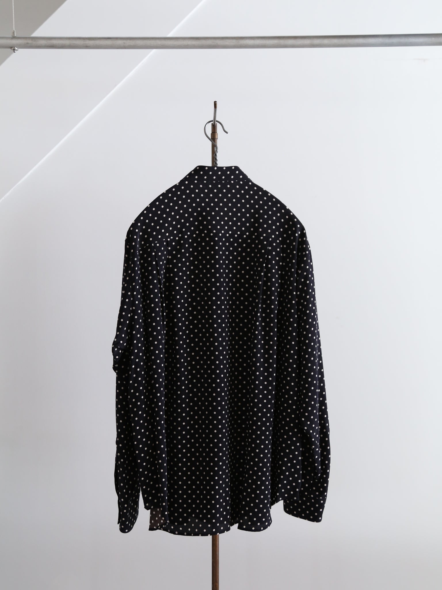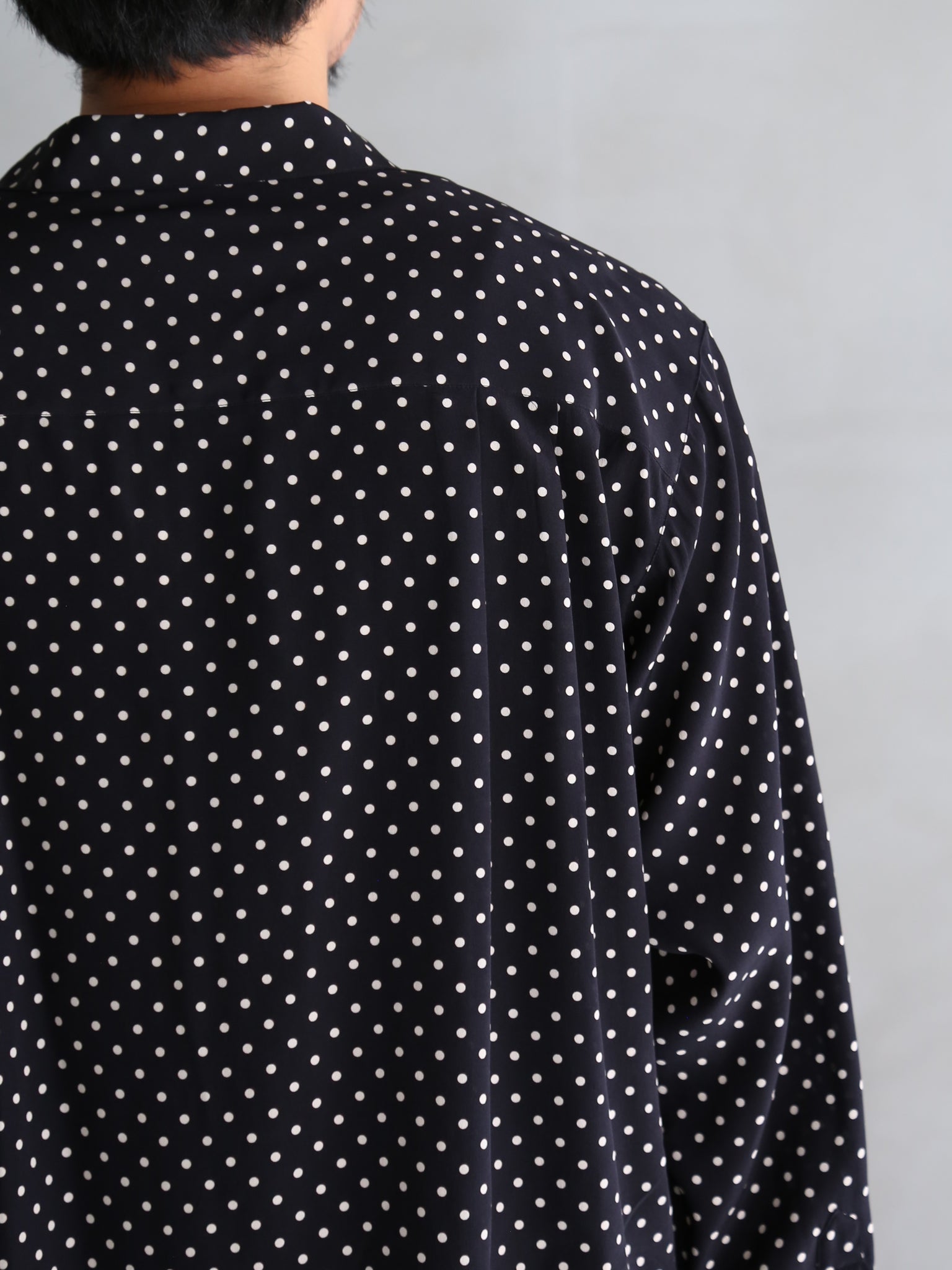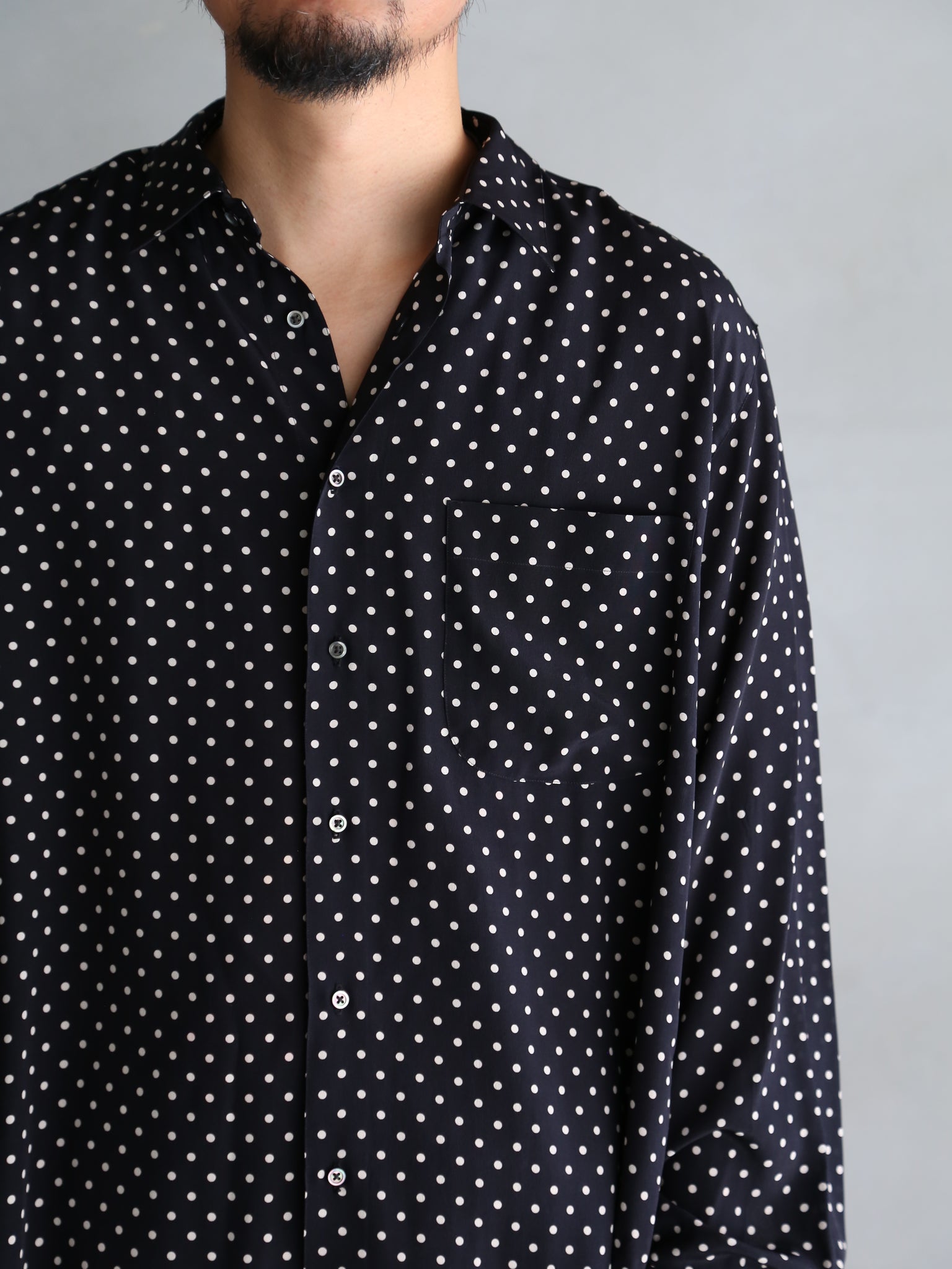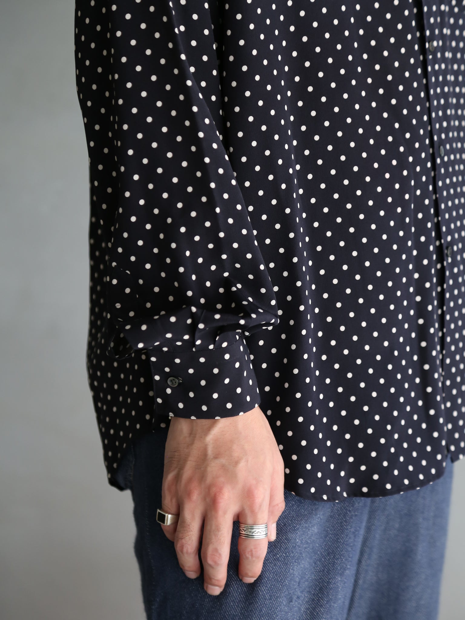 シルクのジョーゼト、ベースにドット柄をプリントしたオリジナル⽣地を使⽤。SS定番のALF型で作成されたモデル。サラッとしたドライタッチな生地感が肌離れ良く、空気をはらみとても軽快な着用感です。