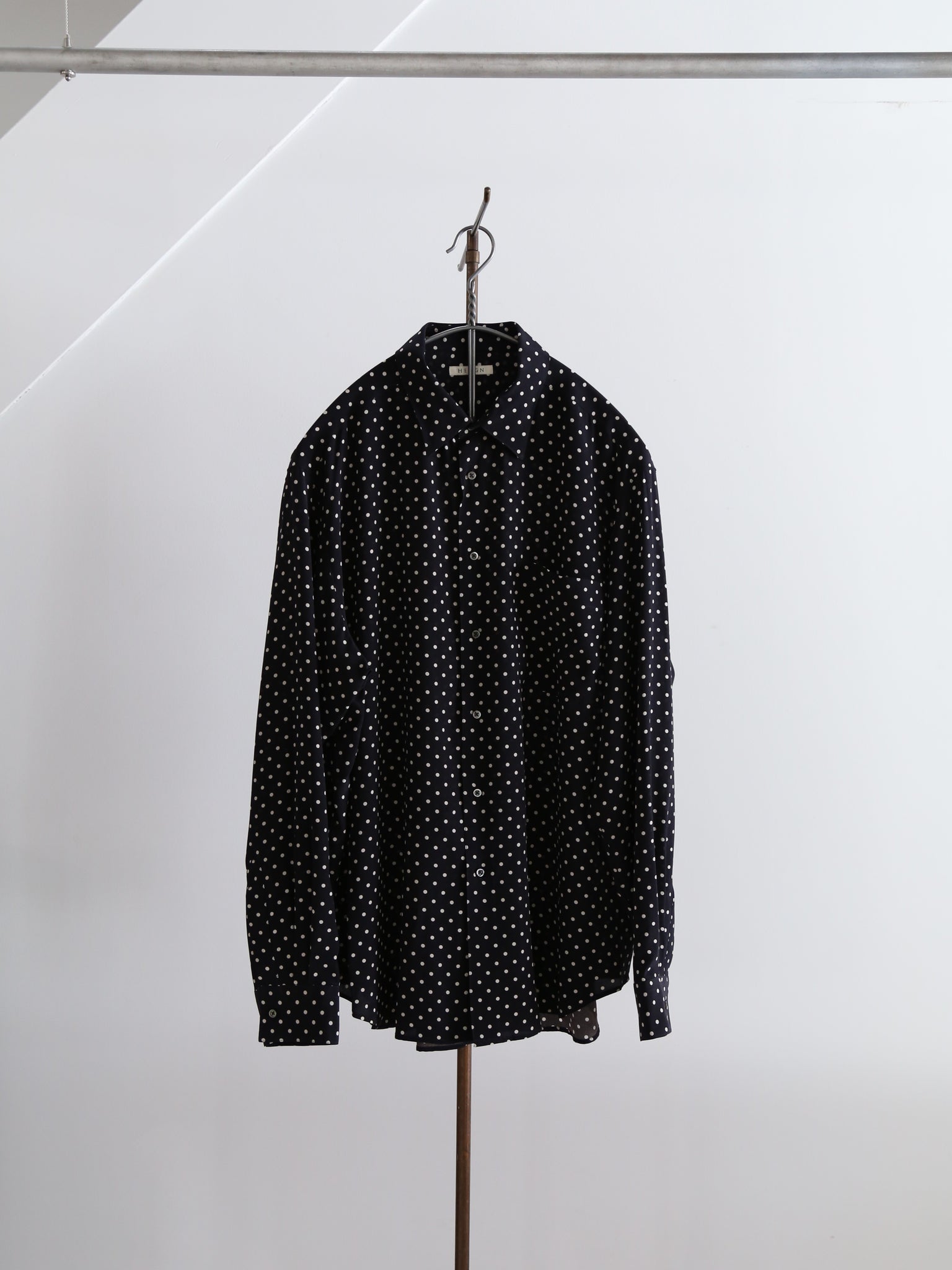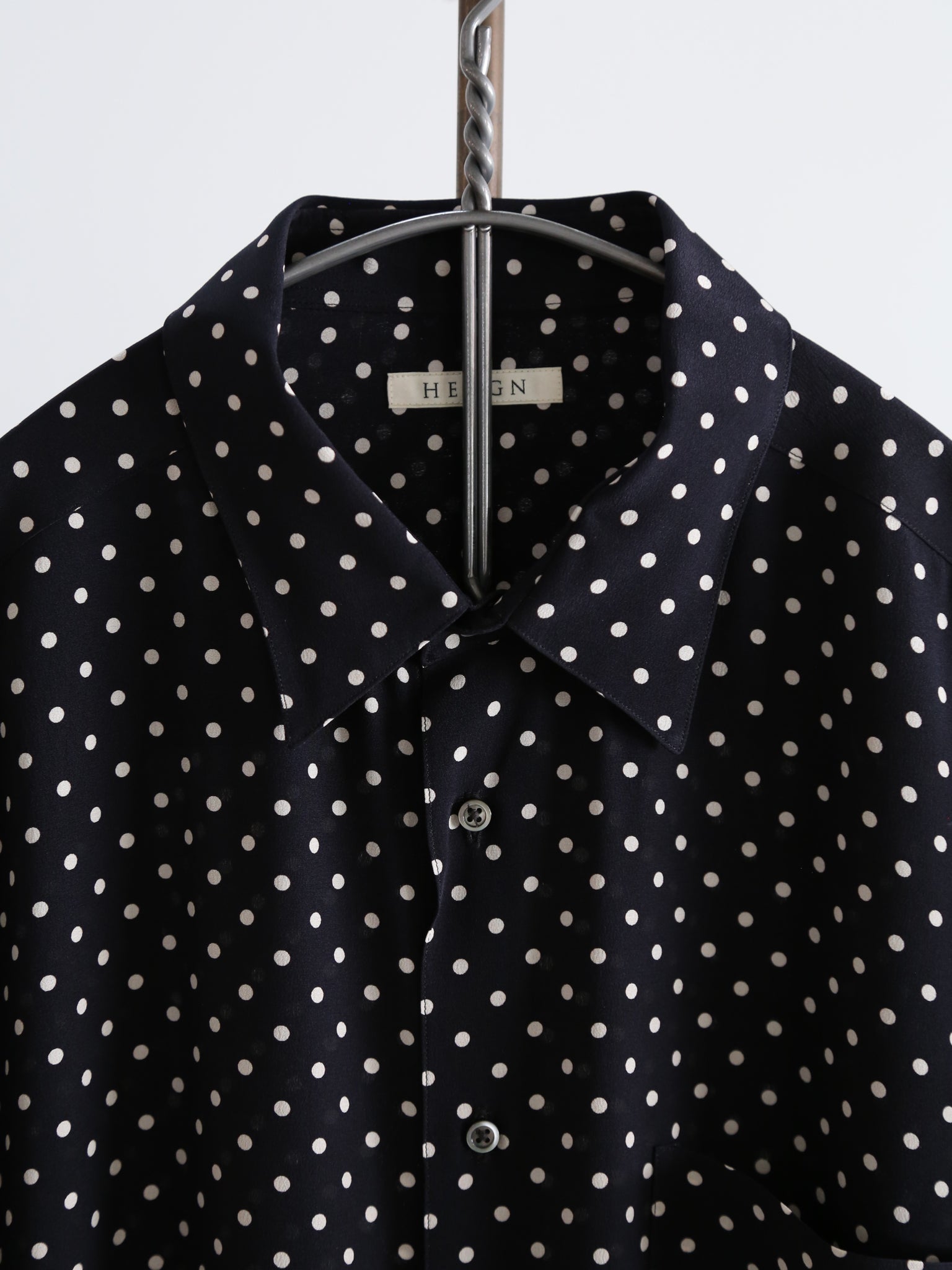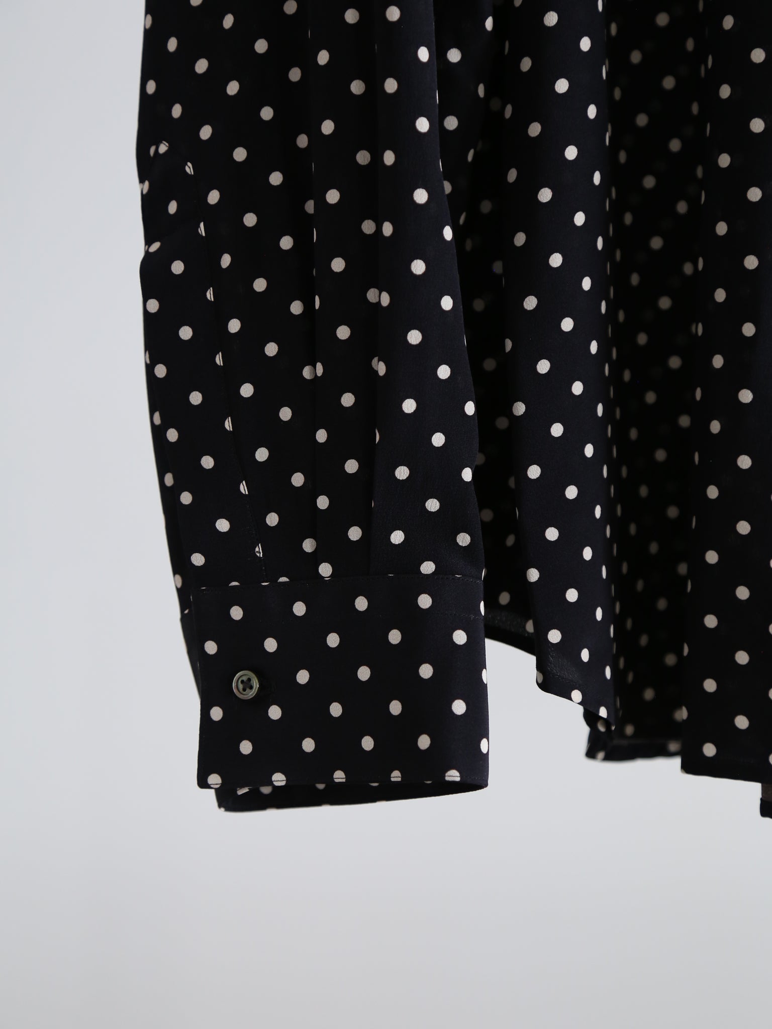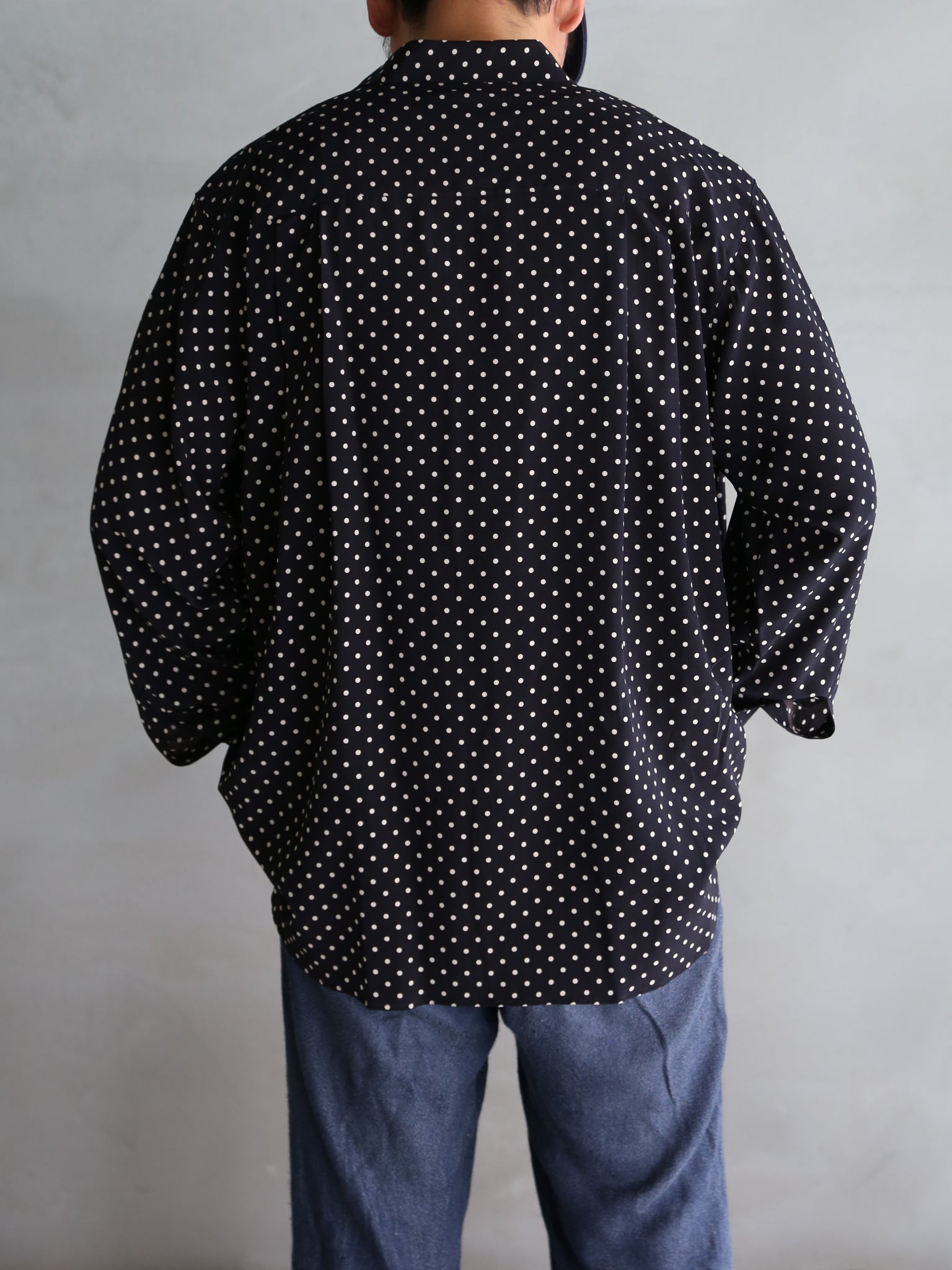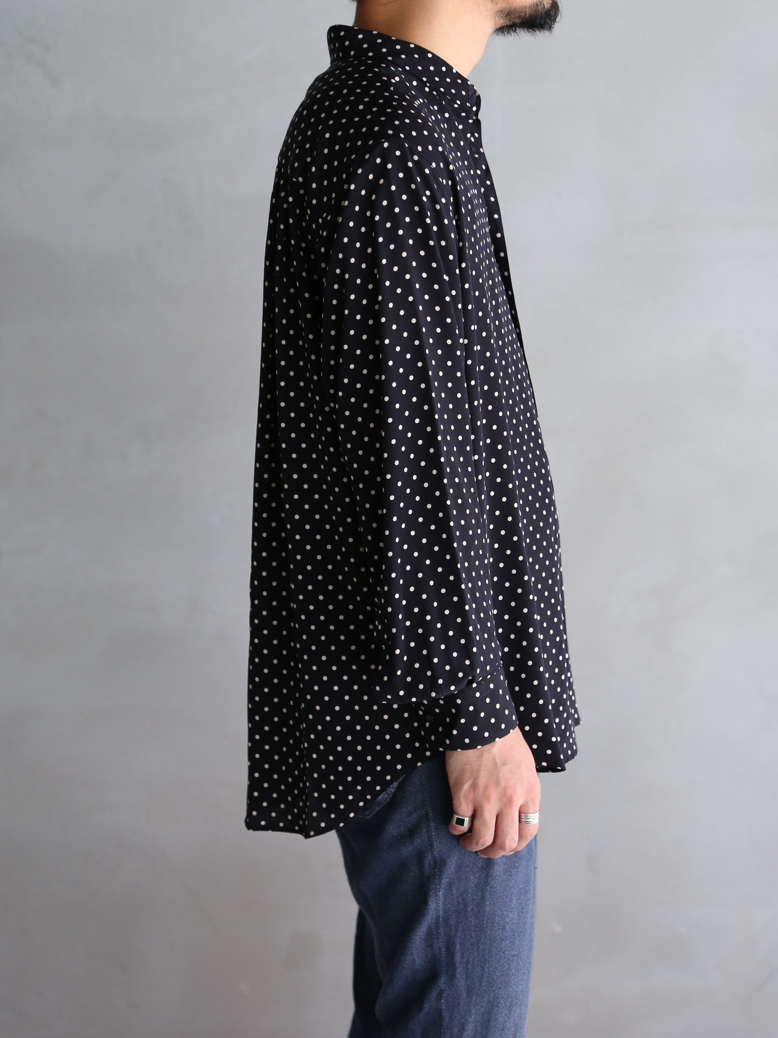 シルクのジョーゼト、ベースにドット柄をプリントしたオリジナル⽣地を使⽤。SS定番のALF型で作成されたモデル。サラッとしたドライタッチな生地感が肌離れ良く、空気をはらみとても軽快な着用感です。