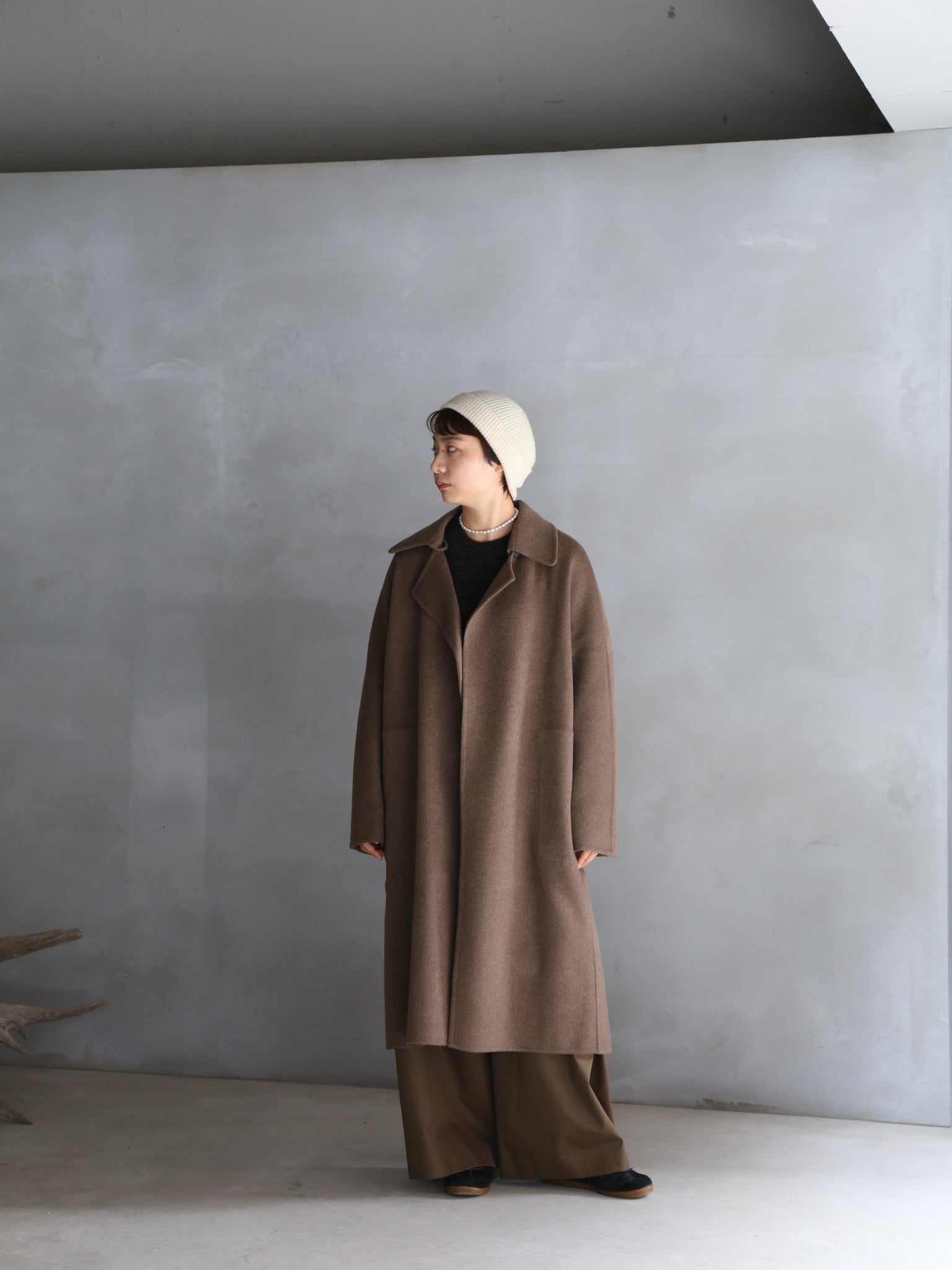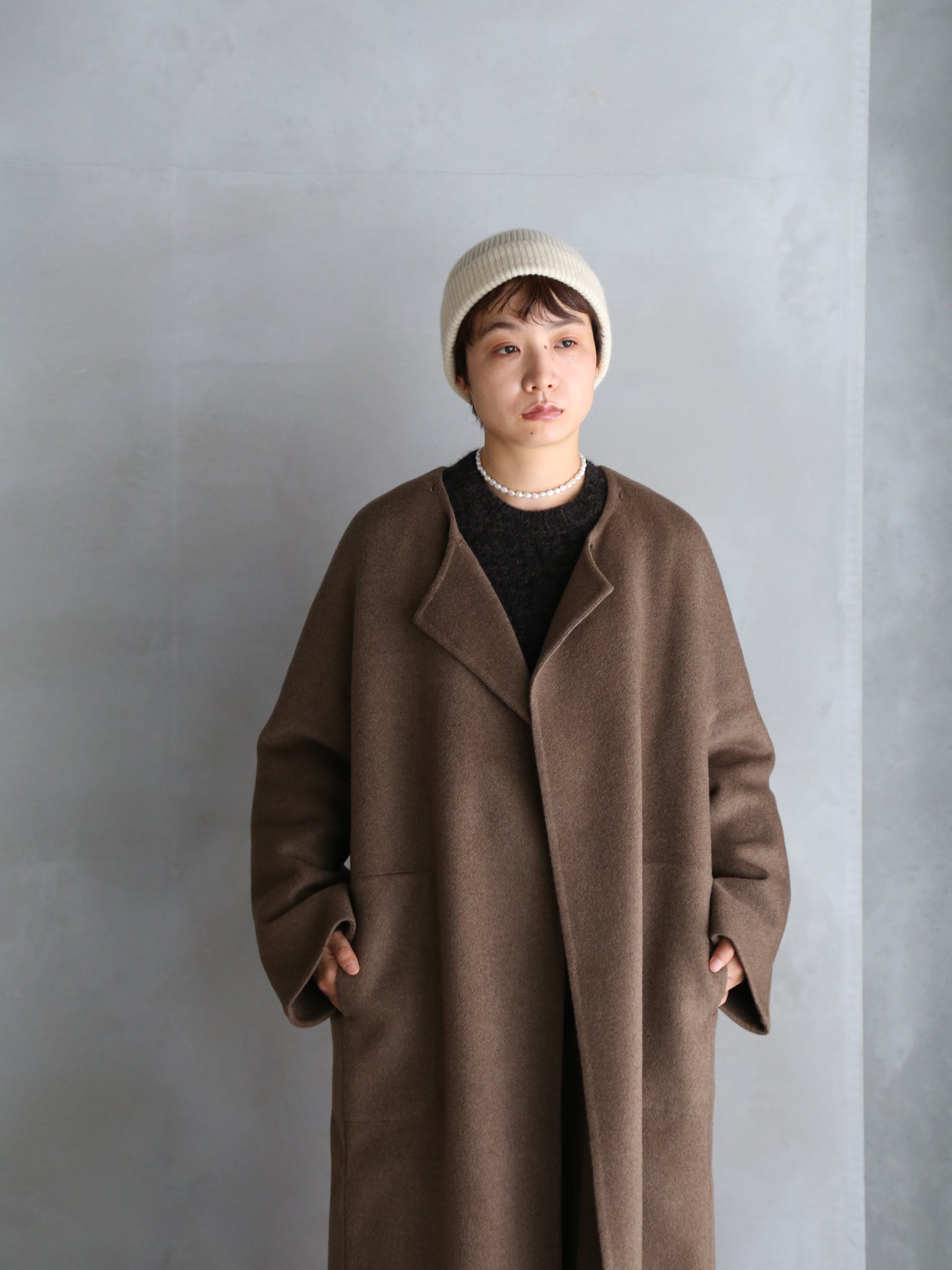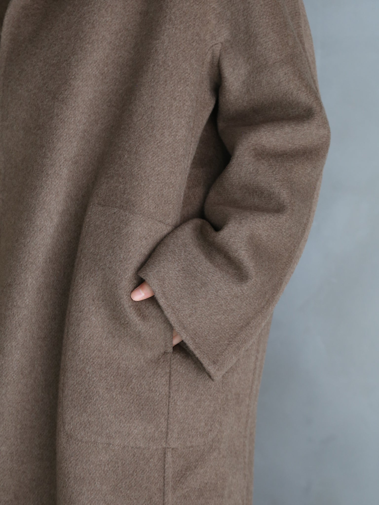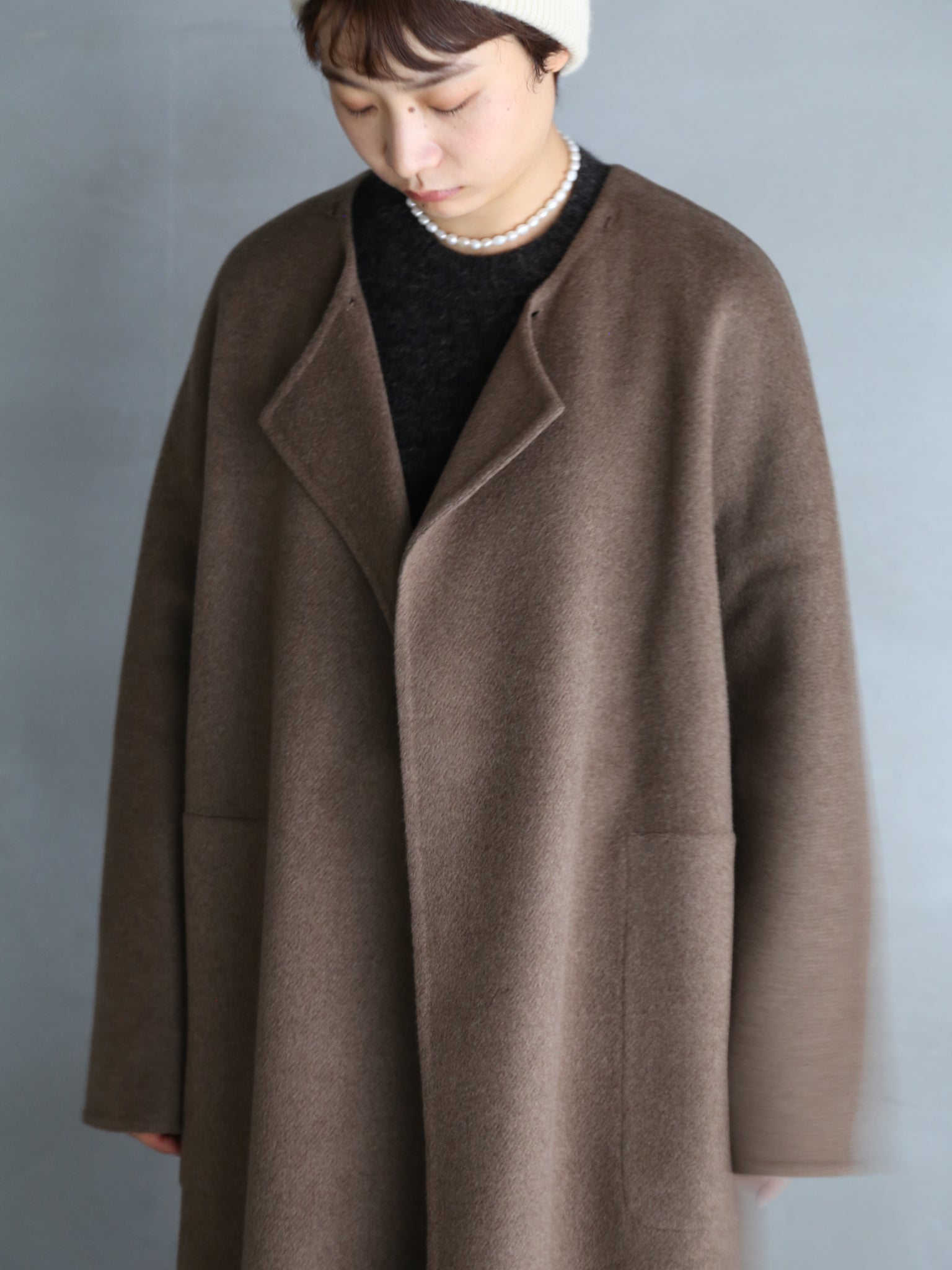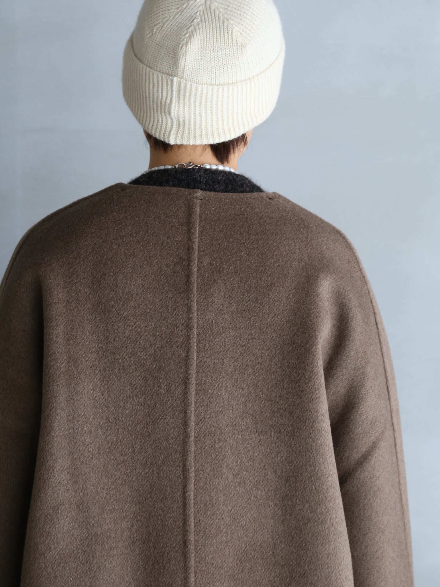 seyaの定番アイテム。首回りの柔らかいヤクの毛だけを使用した生地は、贅沢なダブルフェイス仕立て。仕上げの工程では、生地を1日1晩水に浸し、その後ブラッシングを行います。この工程を3~4回繰り返すことで、優しい光沢と柔らかい手触りが生まれます。とても暖かく軽量。取り外し可能な襟、内側のホーンボタン、ステッチ入りポケットのディテール付き。オーバーサイズフィット。