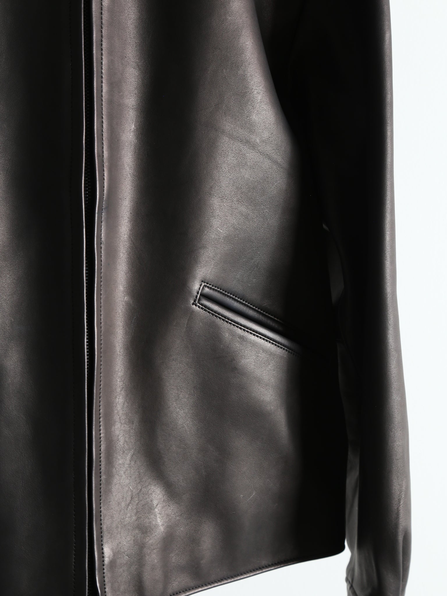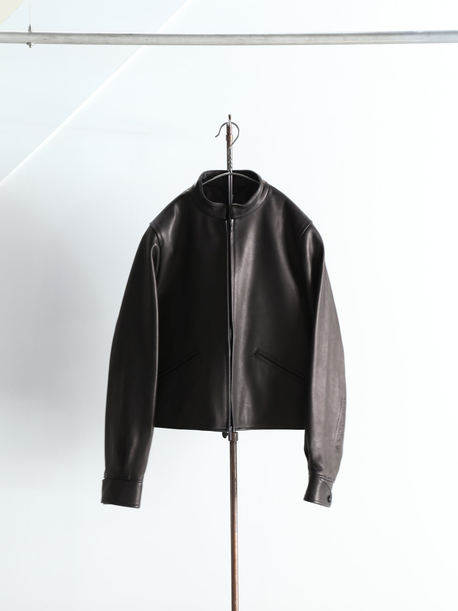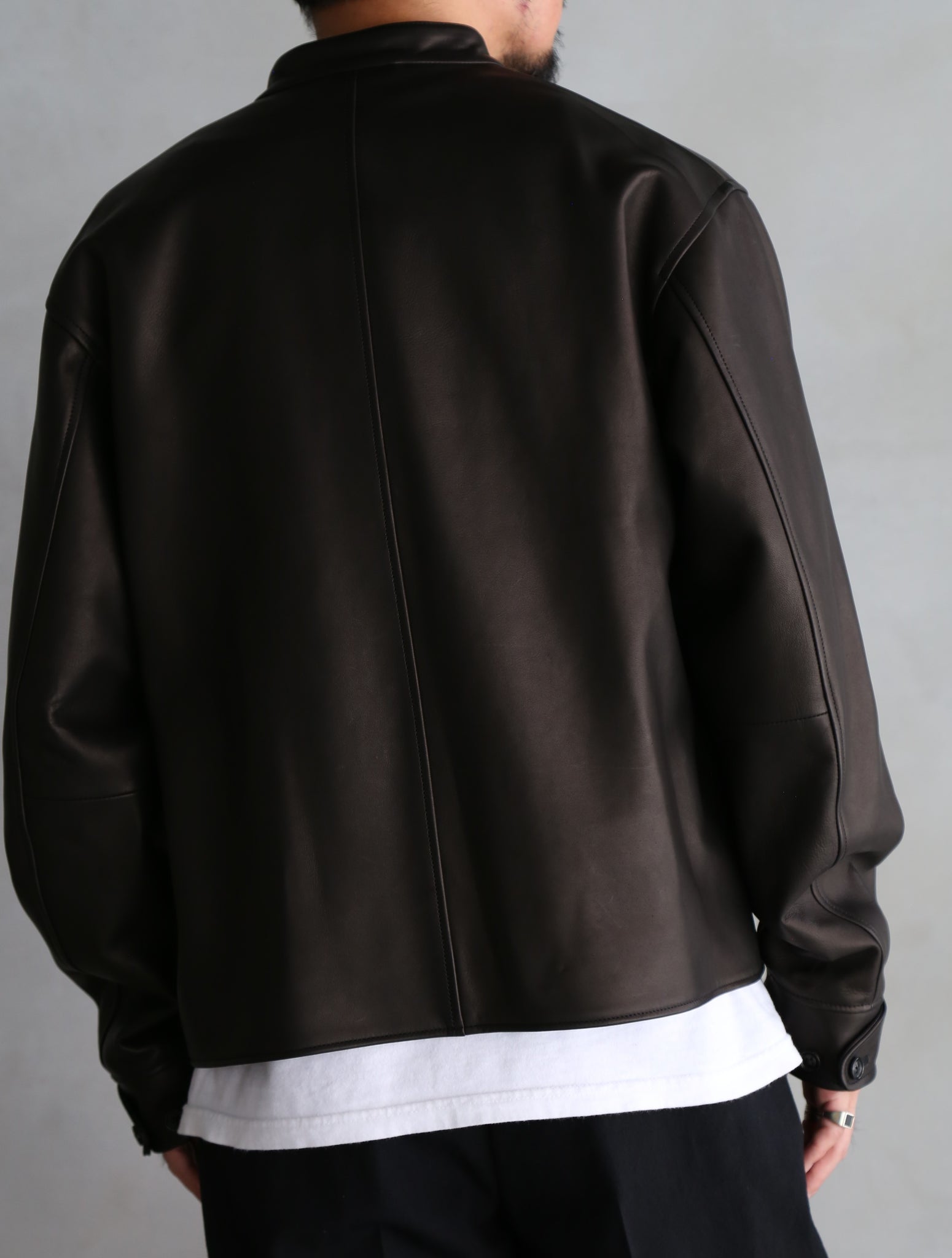 過剰な装飾を排し、ミニマルなデザインで仕立てたフロントジップレザージャケット。素材は、スペイン産ラムレザー。しなやかで肌に吸い付くような質感を持ち、光沢を抑えた素上げ仕上げによって、革本来の美しさを最大限に引き出しています。※素材の特性上、ひっかき傷や色落ち、色移りが発生いたします。