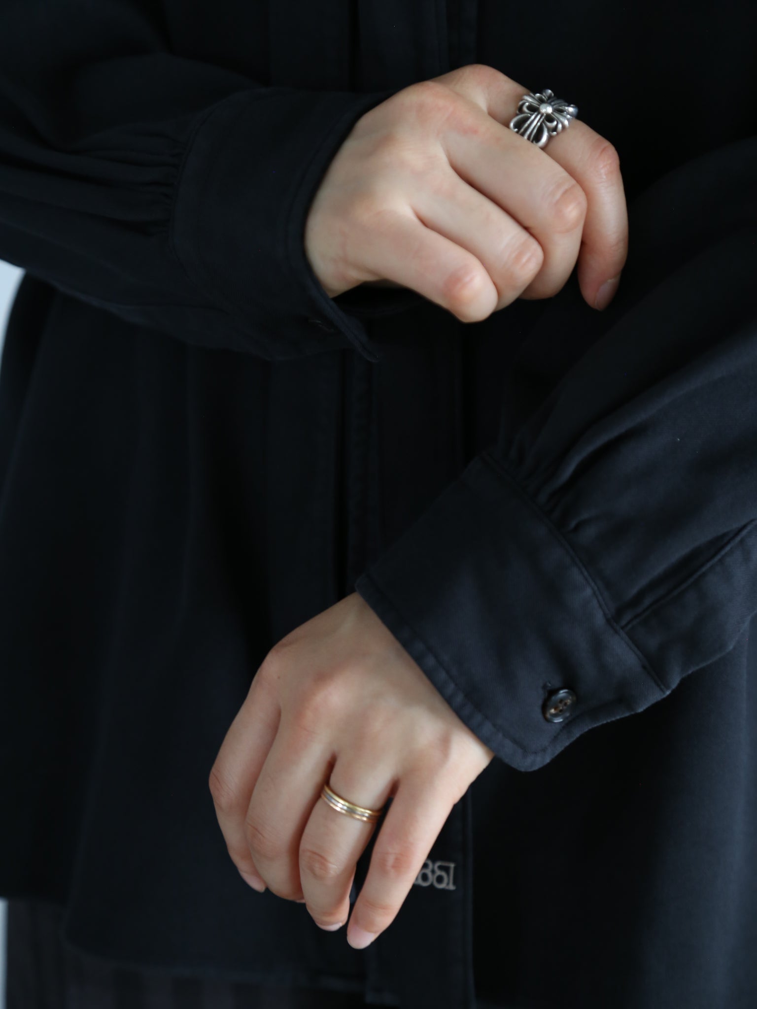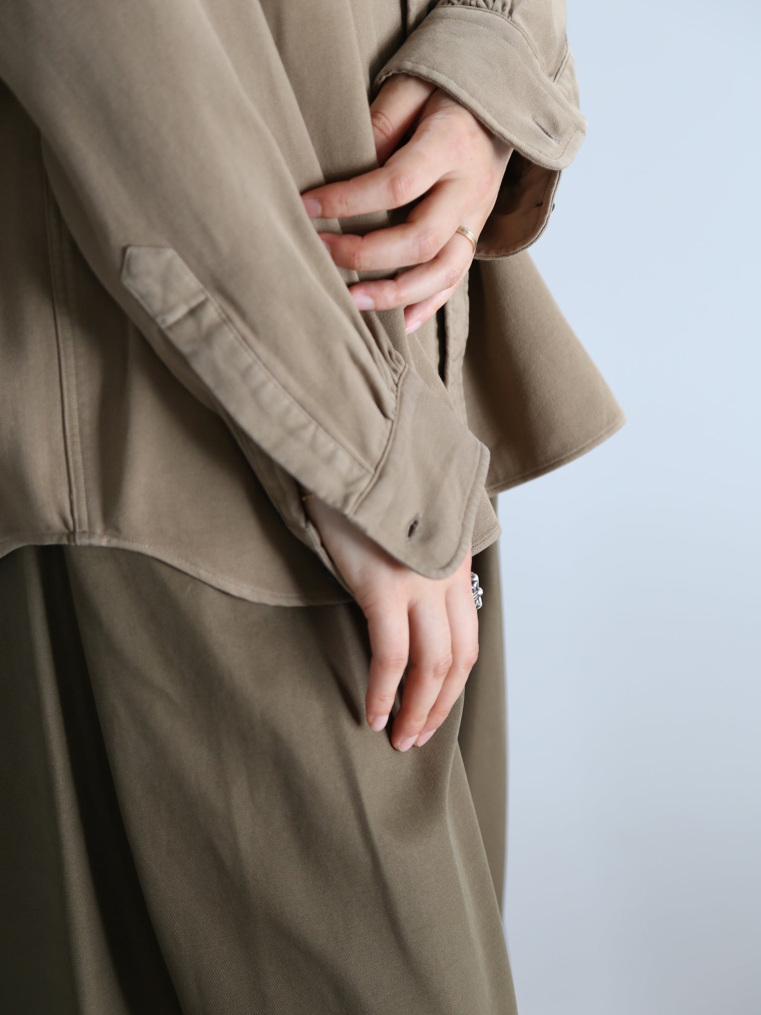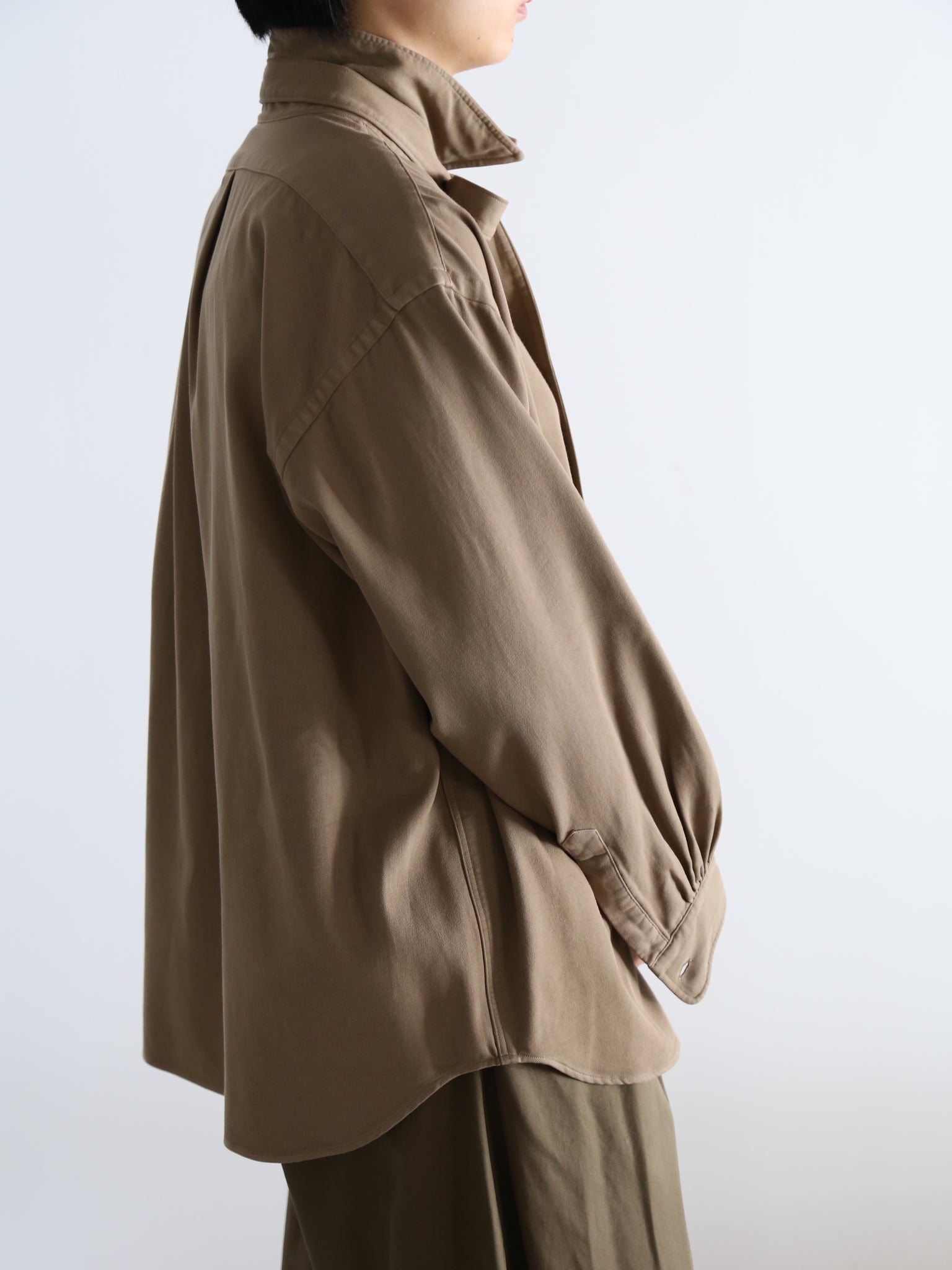 また、生地の前処理工程には連続機を使わず、あえて手間のかかるジッカー機を用いることで、生地へのテンションを抑え、ふっくらとした風合いを実現。さらに、最終仕上げであえてシルケット加工を省くことで、綿本来の膨らみと柔らかさを感じられる仕上がりになっています。オーバーサイズのシルエットに、共生地のストレートリボンを組み合わせ、リボンにはロゴマークの刺繍入りです。