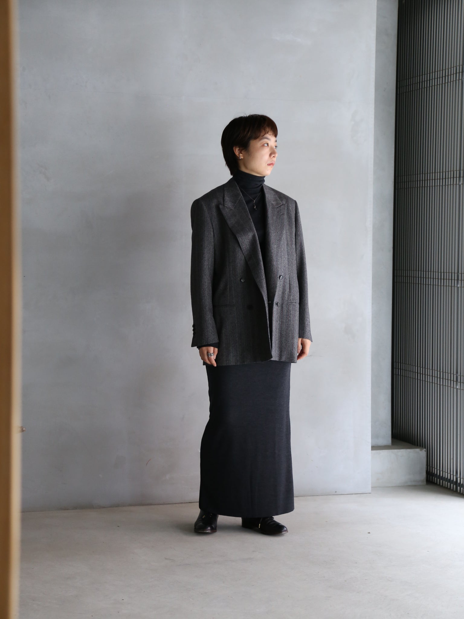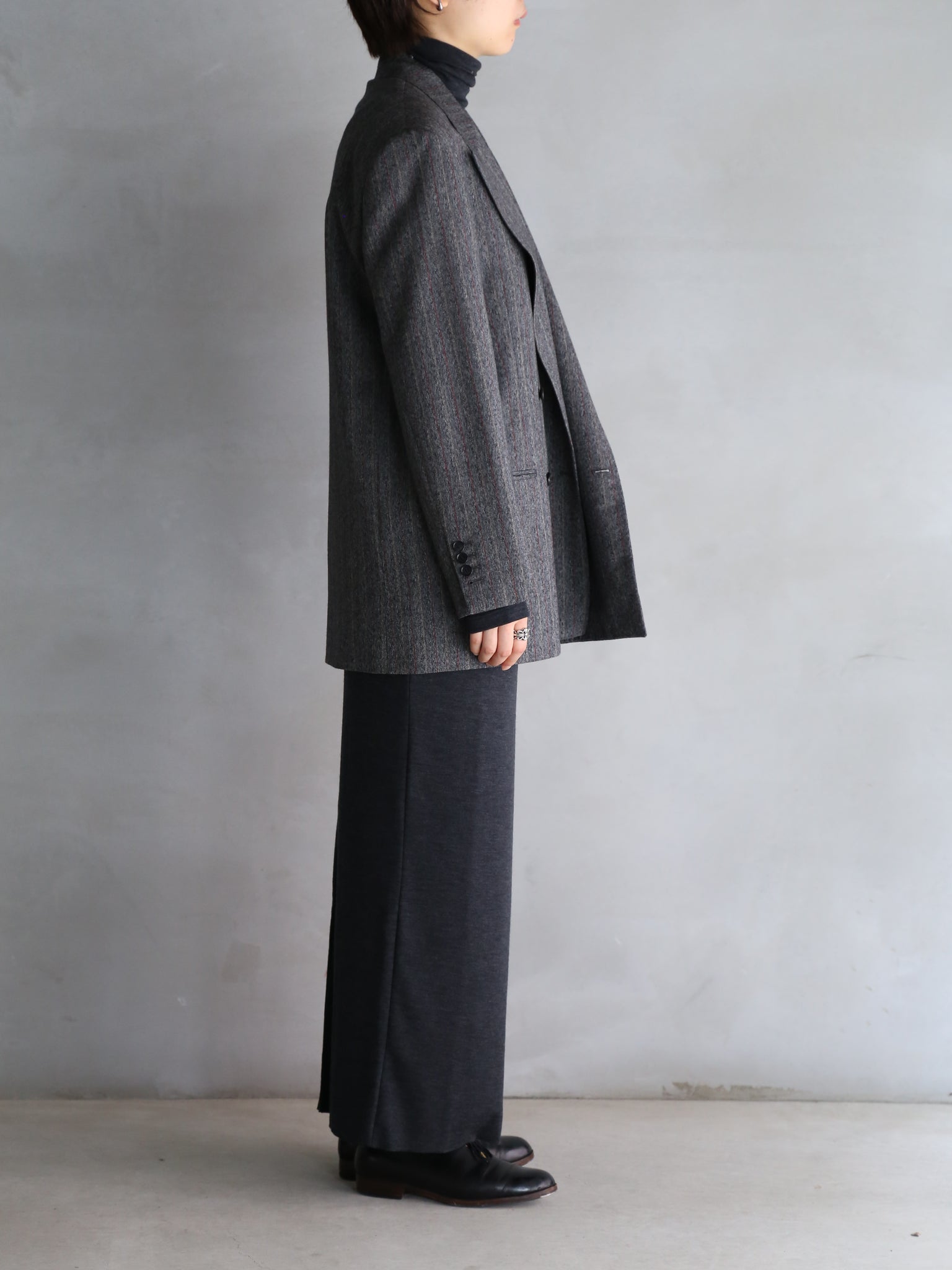 90年代前半のディテールを忠実に再現しつつ、BOWTEならではの造り毛芯とメンズテーラー縫製で仕立てたニューモデル。肩はしっかりと構築的でありながら、薄めのパッドでナチュラルな表情を演出。ラペルやその返り線は低めに設定され、着丈・裄丈もぐっと長めに仕上げることで、当時を思わせる時代性を宿しています。裾はノーベント仕様で、全体にすっきりとしたシルエットにブラッシュアップ。素材にはオーストラリア産エクストラファインメリノの高級梳毛を用い、モダンとクラシックを融合させた一着です。